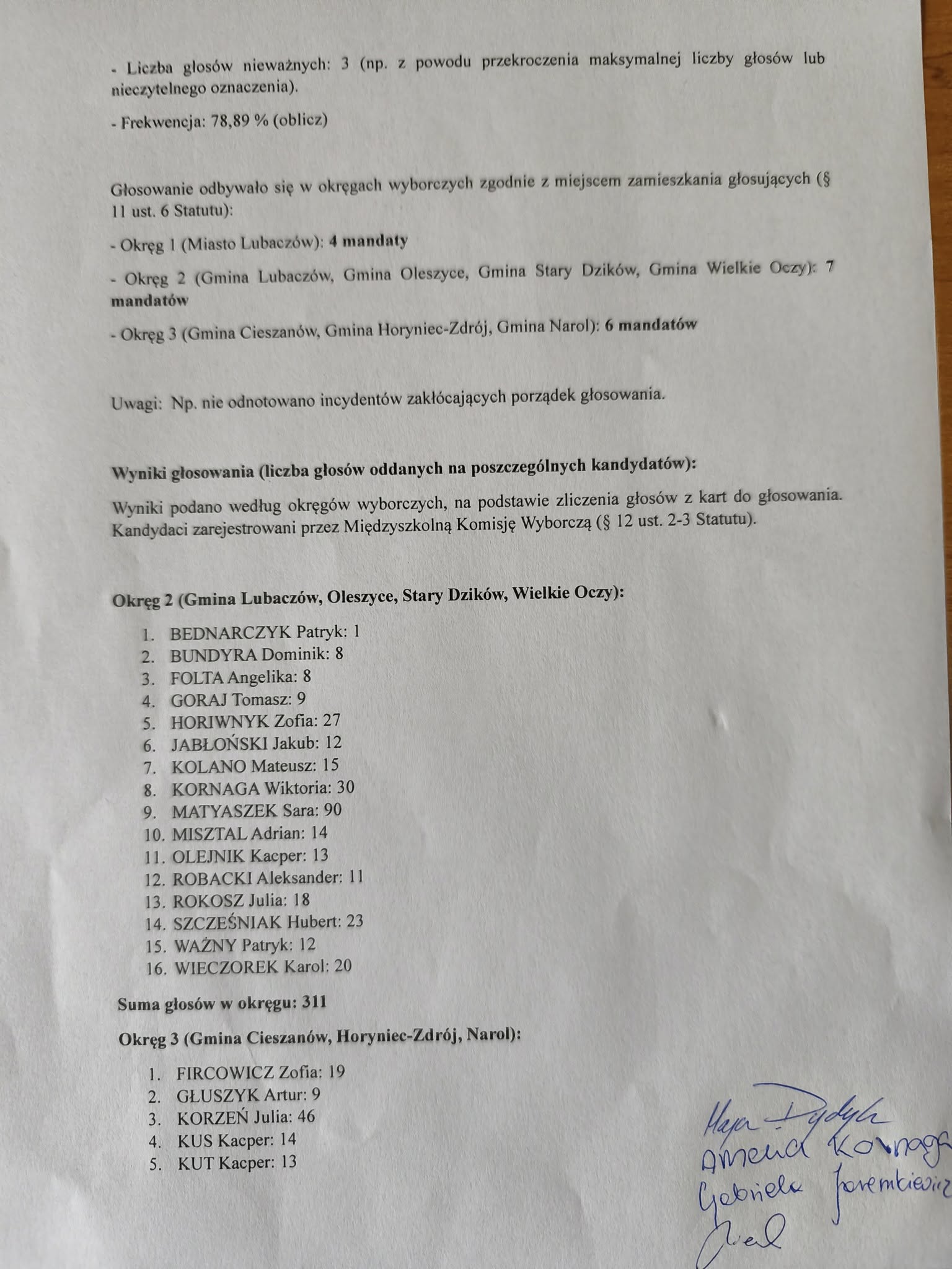Na zakończenie dnia Szkolna Komisja Wyborcza sporządziła protokół z głosowania, który został wywieszony na drzwiach wejściowych.